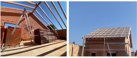 - montáž krovu (dřevěná konstrukce, vazníky)