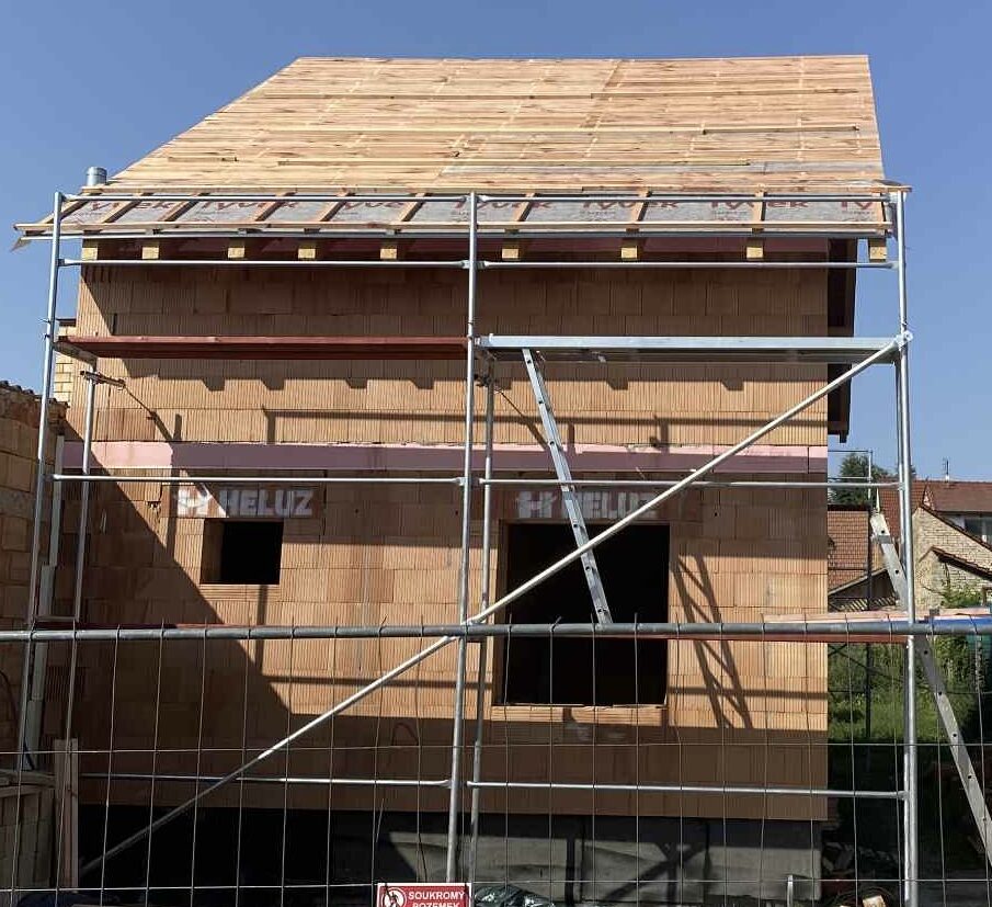 - montáž krovu (dřevěná konstrukce, vazníky)